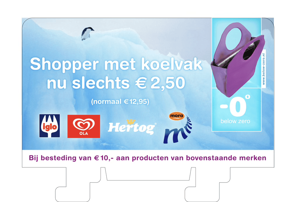 Embedding sits not in a campaign, but in a working ecosystem. In-store, Below Zero becomes visible through innovations that reload the shelf with meaning. Mobile freezers bring frozen closer to the shopper and refresh the shopping experience. Retail trainings improve availability and presentation. An iconic example is the Below Zero Shopper with integrated cooling compartment, designed by Richard Hutten, which literally carries the frozen story into the store.